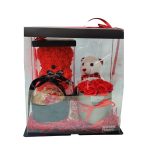 Aληθινό αποχυμωμένο τριαντάφυλλο σε βελούδινο μαύρο θόλο, χουχουλιάρικο λούτρινο αρκουδάκι LOVE με πούλιες κόκκινες, κουτί με σαπουνίνια κόκκινα, αρκούδι rose bear medium, και σοκοφρέτα lacta!