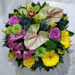 Στρογγυλή σύνθεση σε ίνοξ βάση, με ανθούρια, αλστρομέρειες, ερίτζιουμ σουπερνόβα, σολιντάστερ, ολλανδικά χρυσάνθεμα, ορχιδέες σιμπίτιουμ, τριαντάφυλλα, τσίκο και κούμαρο.
