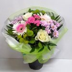 Στρογγυλό μπουκέτο σε φούξια – λευκές – λαχανί αποχρώσεις με ζέρμπερες, τριαντάφυλλα, ολλανδικά χρυσάνθεμα, μπουτόν τριανταφυλλάκι και ολλανδικές πρασινάδες.