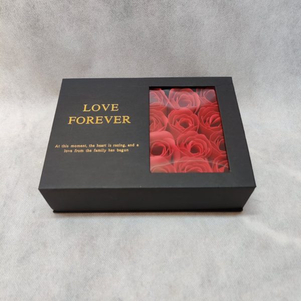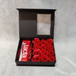 Μαύρο κουτί, με μυρωδάτα σαπουνίνια σε σχήμα τριαντάφυλλου χρώματος κόκκινου, με μυρωδιά κερασιού, και σοκολάτα lacta.