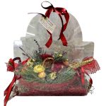 Εορταστική σύνθεση με έλατο, πεύκο, τούγια, κουκουνάρια, αποξηραμένα διακοσμητικά, στάχυα, λεβάντα, τριαντάφυλλα, σε υπέροχη διάφανη τσαντούλα!