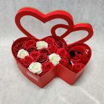 Κουτί σε διπλό σχήμα καρδιάς, με μυρωδάτα σαπουνίνια σε σχήμα τριαντάφυλλου χρώματος κόκκινου, μπορντώ και λευκού, και λούτρινο κόκκινο αρκούδι.