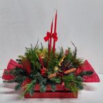 Ξύλινο καφάσι με κόκκινο κερί, ορχιδέα σιμπίτιουμ, έλατο, τούγια, πεύκο, κουκουνάρια, αποξηραμένα φρούτα, σολιντάγκο, κανέλες, γκι και κόκκινο πλατάνι.