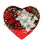 Κόκκινο ή μαύρο κουτί με κόκκινα τριαντάφυλλα, ορχιδέες σιμπίντιουμ, υπέρικουμ, και πλάτμους.