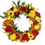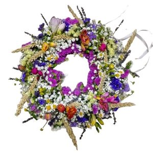 Μαγιάτικο στεφάνι με τριαντάφυλλα, ζέρμπερες, γαρύφαλλο, ολλανδικά χρυσάνθεμα, αμάραντο και σολιντάστερ. Ας γεμίσουμε αρώματα και χρώματα το σπίτι μας!