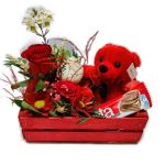 Καφάσι με κόκκινα τριαντάφυλλα και λευκά, λούτρινο αρκουδάκι και σοκοφρέτα lacta.