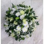 Καλάθι με λευκά λίλιουμ καζαμπλάνκα, τριαντάφυλλα, γυψοφύλλη και ολλανδικά χρυσάνθεμα, γιατί δυστυχώς και οι δύσκολες στιγμές, είναι μέρος της ζωής όλων μας.