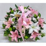 Καλάθι με ροζ ανοιχτό και λευκές αποχρώσεις, με λίλιουμ, καζαμπλάνκα λίλιουμ, σταλιόν ολλανδικό χρυσάνθεμο, τριαντάφυλλα, ορχιδέες σιμπίτιουμ, γυψοφίλλη και ολλανδικά φυλλώματα. Μπορείτε να επιλέξετε και ολόλευκο χρώμα σε όλα τα λουλούδια.