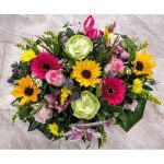 Καλάθι με διπλό χερούλι, με ηλίανθους, τριαντάφυλλα, καζαμπλάνκα λίλιουμ, καλλωπιστικό λάχανο, τριαντάφυλλα, οριχδέες σιμπίτιουμ, ερίτζιουμ, χρυσάνθεμα, χαμομήλι, σοντιντάστερ, τσικόφυλλα, κόκκους και κούμαρο.