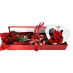 Σετ σε παραλληλόγραμμο κόκκινο κουτί με ανθοδέσμη από 5 κατακόκκινα φρέσκα τριαντάφυλλα, κόκκινο λούτρινο αρκουδάκι σε λευκή πλεκτή καρδιά, και σοκολατάκια lacta.