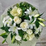 Μπουκέτο με λευκά άνθη και φυλλώματα. Τριαντάφυλλα λευκά, καζαμπλάνκα λίλιουμ, εποχιακές μπράτσικες, και ολλανδικά χρυσάνθεμα.