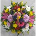 Καλάθι με τριαντάφυλλα, ζέρμπερες, αναστασία ροζάνο, λίλιουμ, ολλανδικά χρυσάνθεμα, άλιουμ, ερίτζιουμ σουπερνόβα, σολιντάστερ, και ολλανδικες πρασινάδες.