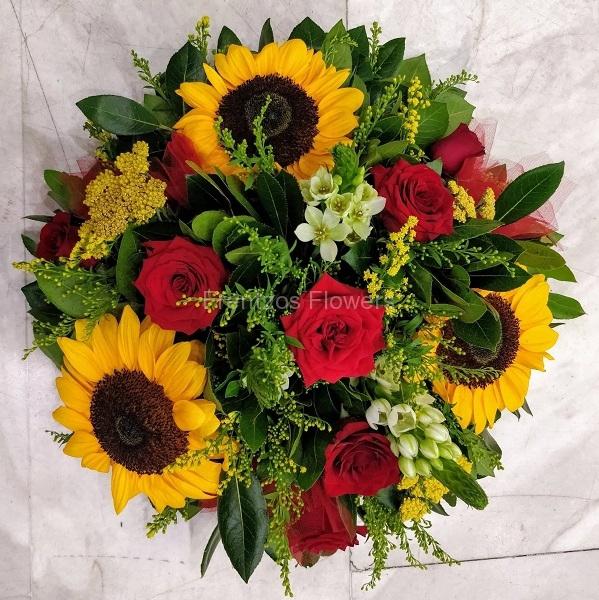Ίνοξ κασπώ με ηλίανθους, κόκκινα τριαντάφυλλα, αχιλλέα, ορνιθογκάλουμ, σολιντάγκο, κούμαρο, τσίκο, κοκόφυλλα.