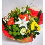 Έντονο μπουκέτο σε πορτοκαλί, κίτρινες και λευκές αποχρώσεις, με τριαντάφυλλα, λίλιουμ οριεντάλ, ζέρμπερες, σολιντάγκο, ολλανδικά χρυσάνθεμα, σταλιόν και φυλλώματα.