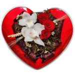 Πιατέλα σε σχήμα κόκκινης καρδιάς με κόκκινα τριαντάφυλλα, ορχιδέες σιμπίτιουμ, πλάτμους και φυλλώματα.