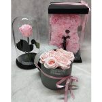 Σε συνδυασμό με αληθινό αποχυμωμένο τριαντάφυλλο σε γυάλα καμπάνα μεσαίου μεγέθους, και κουτί με 7 μυρωδάτα ροζ σαπουνίνια!