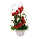 Εντυπωσιακότατη όρθια σύνθεση με κόκκινα τριαντάφυλλα σε στυλ σπιράλ, με σάλεξ και ολλανδικά φυλλώματα, σε ξύλινη ή γυάλινη οβάλ βάση.