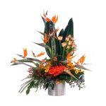 Σύνθεση με στερλίτσιες, τριαντάφυλλα, υπερίκουμ και ολλανδικές πρασινάδες.