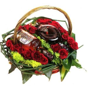 Διάφανη τσάντα με λούτρινο αρκούδι, σοκοφρέτες και σοκολάτες, μπαλόνι foil και τριαντάφυλλα από σαπούνι σε ανθοδέσμη.