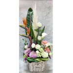 Όρθια σύνθεση με διάφορα χρώματα, από τριαντάφυλλα, στερλίτσιες, ζέρμπερες, κάλλες, αναστασίες ετρούσκο, pampas grass, τριαντάφυλλα, αμάραντος, λυσίανθος και φυλλώματα.