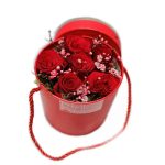 Κόκκινο κουτί με κόκκινα τριαντάφυλλα, γυψοφύλλη και πλάτμους.