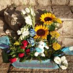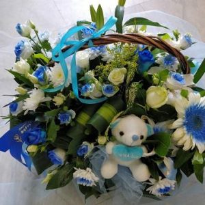 Χειροποίητη ξύλινη αποκλειστικά δικής μας κατασκευής μακρόστενο κασπώ, με τριαντάφυλλα, ζέρμπερες, λυσσίανθο, ηλίανθους, σολιντάστερ και ολλανδικές πρασινάδες, με μικρού μεγέθους αρκουδάκι. Μπορείτε να επιλέξετε την ίδια σύνθεση για γέννηση κοριτσιού, σε ροζ – λευκές αποχρώσεις και με το αντίστοιχο ροζ αρκουδάκι.
