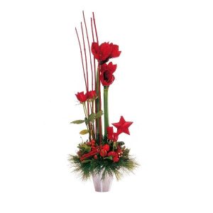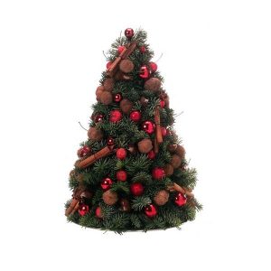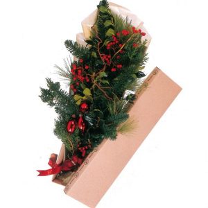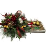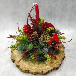 Ξύλινος δίσκος με εορταστική σύνθεση με τριαντάφυλλα, λαγομηλιά, γκι, γκραβιλέα, κουκουνάρια, έλατο, πεύκο και τούγια.